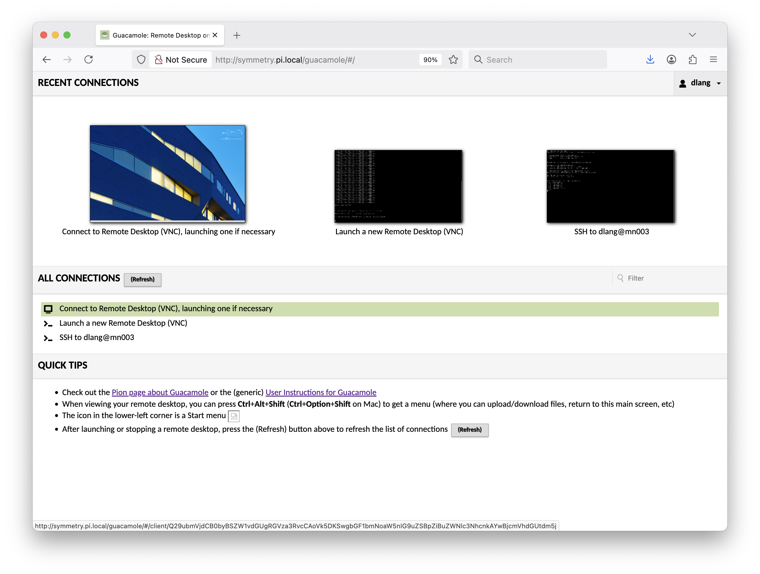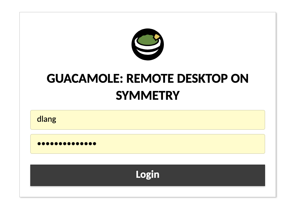 You can log in to the Guacamole remote desktop service at http://symmetry.pi.local/guacamole/#/